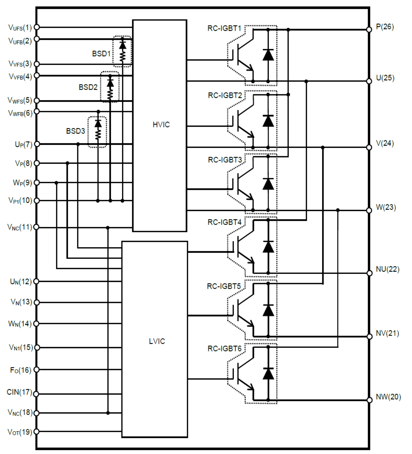 - Temperature monitoring: Outputting LVIC temperature by analog signal, Arm short circuit prevention: Interlock (IL)